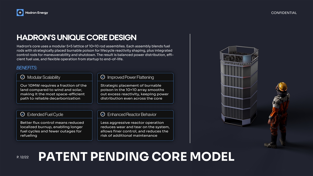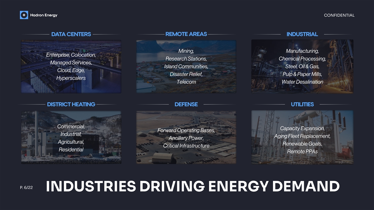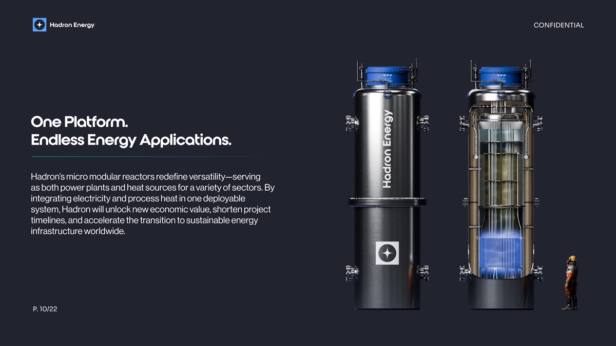 CONFIDENTIAL One Platform. Endless Energy Applications. Hadron’s micro modular reactors redefine versatility—serving as both power plants and heat sources for a variety of sectors. By integrating electricity and process heat in one deployable system, Hadron will unlock new economic value, shorten project timelines, and accelerate the transition to sustainable energy infrastructure worldwide. P. 10/22
