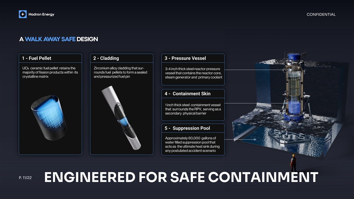 CONFIDENTIAL A WALK AWAY SAFE DESIGN 1 - Fuel Pellet 2 - Cladding 3 - Pressure Vessel UO2� ceramic fuel pellet retains the Zirconium alloy cladding that sur- 3-4 inch thick steel reactor pressure majority of fission products within its rounds fuel pellets to form a sealed vessel that contains the reactor core, crystalline matrix and pressurized fuel pin steam generator and primary coolant 4 - Containment Skin 1 inch thick steel containment vessel that surrounds the RPV, serving as a secondary physical barrier 5 - Suppression Pool Approximately 60,000 gallons of water filled suppression pool that acts as the ultimate heat sink during any postulated accident scenario P. 11/22 ENGINEERED FOR SAFE CONTAINMENT