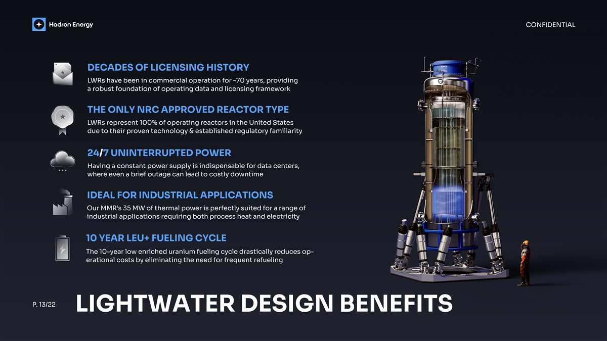 CONFIDENTIAL DECADES OF LICENSING HISTORY LWRs have been in commercial operation for ~70 years, providing a robust foundation of operating data and licensing framework THE ONLY NRC APPROVED REACTOR TYPE LWRs represent 100% of operating reactors in the United States due to their proven technology & established regulatory familiarity 24/7 UNINTERRUPTED POWER Having a constant power supply is indispensable for data centers, where even a brief outage can lead to costly downtime IDEAL FOR INDUSTRIAL APPLICATIONS Our MMR’s 35 MW of thermal power is perfectly suited for a range of industrial applications requiring both process heat and electricity 10 YEAR LEU+ FUELING CYCLE The 10-year low enriched uranium fueling cycle drastically reduces op- erational costs by eliminating the need for frequent refueling P. 13/22 LIGHTWATER DESIGN BENEFITS