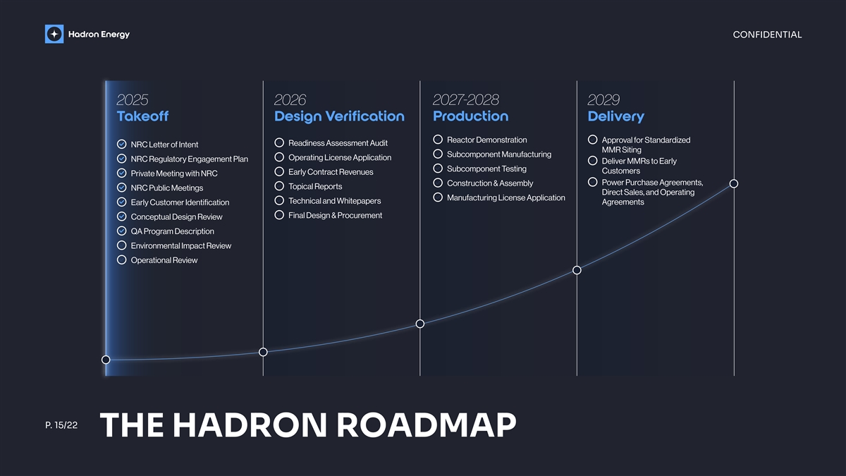 CONFIDENTIAL 2025 2026 202 7 -202 8 2029 Takeoff Design Verification Production Delivery Reactor Demonstration Approval for Standardized Readiness Assessment Audit NRC Letter of Intent MMR Siting Subcomponent Manufacturing Operating License Application NRC Regulatory Engagement Plan Deliver MMRs to Early Subcomponent Testing Customers Early Contract Revenues Private Meeting with NRC Power Purchase Agreements, Construction & Assembly Topical Reports NRC Public Meetings Direct Sales, and Operating Manufacturing License Application Technical and Whitepapers Agreements Early Customer Identification Final Design & Procurement Conceptual Design Review QA Program Description Environmental Impact Review Operational Review P. 15/22 THE HADRON ROADMAP