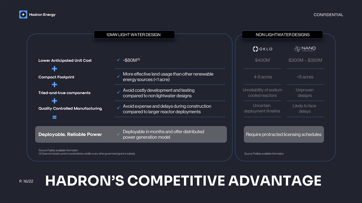CONFIDENTIAL 10MW LIGHT WATER DESIGN NON LIGHTWATER DESIGNS (1) Lower Anticipated Unit Costü ~$80M $400M $300M $350M - More effective land usage than other renewable Compact Footprintü 4-5 acres <5 acres energy sources (<1 acre) Unreliability of sodium Unproven Avoid costly development and testing Tried-and-true componentsü cooled reactors designs compared to non lightwater designs Uncertain Likely to face Avoid expense and delays during construction ü Quality Controlled Manufacturing deployment timeline delays compared to larger reactor deployments Deployable in months and offer distributed Deployable, Reliable Power Require protracted licensing schedules ü power generation model Source: Publicly available information (1) Does not include current or potential tax credits or any other government grant or subsidy Source: Publicly available information P. 16/22 HADRON’S COMPETITIVE ADVANTAGE