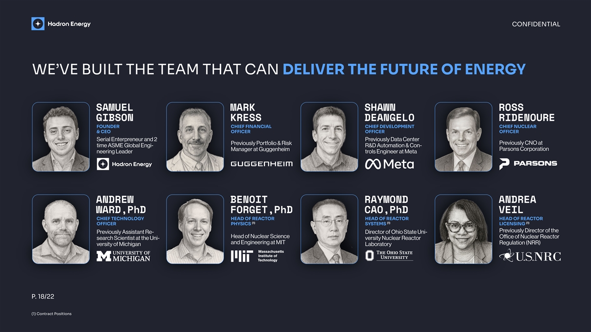 I N D U CONFIDENTIAL ALL STAR ENGINEERING TEAM. DEEP REGULATORY BACKGROUND. “From leading regulatory bodies like the NRC to pioneering propulsion systems at NASA, our all-star team brings frontier engineering expertise, institutional excellence & path to partnerships that can redefine the nuclear ecosystem. In the months ahead, Hadron will expand its team across digital re- actor systems, advanced manufacturing, and safety architecture — bringing together world-class engineers, modelers, and build- ers to accelerate prototype development and carry our reactor from simulation to reality.” – Samuel Gibson, Founder & CEO P. 17/22 S T R Y