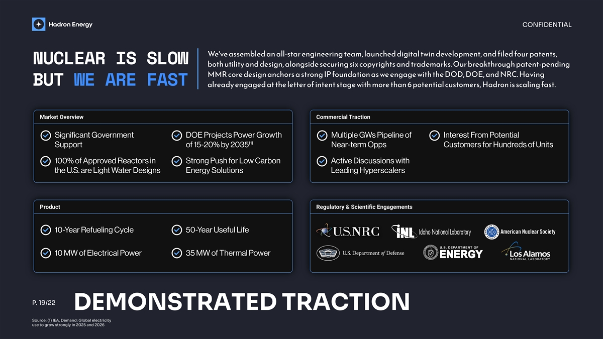 CONFIDENTIAL We've assembled an all-star engineering team, launched digital twin development, and filed four patents, NUCLEAR IS SLOW both utility and design, alongside securing six copyrights and trademarks. Our breakthrough patent-pending MMR core design anchors a strong IP foundation as we engage with the DOD, DOE, and NRC. Having BUT WE ARE FAST already engaged at the letter of intent stage with more than 6 potential customers, Hadron is scaling fast. Market Overview Commercial Traction Significant Government DOE Projects Power Growth Multiple GWs Pipeline of Interest From Potential (1) Support of 15-20% by 2035 Near-term Opps Customers for Hundreds of Units 100% of Approved Reactors in Strong Push for Low Carbon Active Discussions with the U.S. are Light Water Designs Energy Solutions Leading Hyperscalers Product Regulatory & Scientific Engagements 10-Year Refueling Cycle 50-Year Useful Life 10 MW of Electrical Power 35 MW of Thermal Power P. 19/22 DEMONSTRATED TRACTION Source: (1) IEA, Demand: Global electricity use to grow strongly in 2025 and 2026