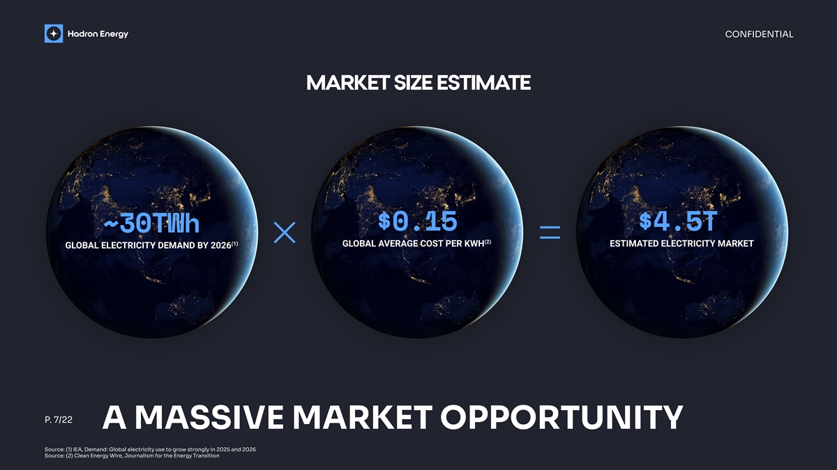 CONFIDENTIAL MARKET SIZE ESTIMATE $0.15 $4.5T ~30TWh (2) (1) GLOBAL AVERAGE COST PER KWH ESTIMATED ELECTRICITY MARKET GLOBAL ELECTRICITY DEMAND BY 2026 P. 7/22 A MASSIVE MARKET OPPORTUNITY Source: (1) IEA, Demand: Global electricity use to grow strongly in 2025 and 2026 Source: (2) Clean Energy Wire, Journalism for the Energy Transition