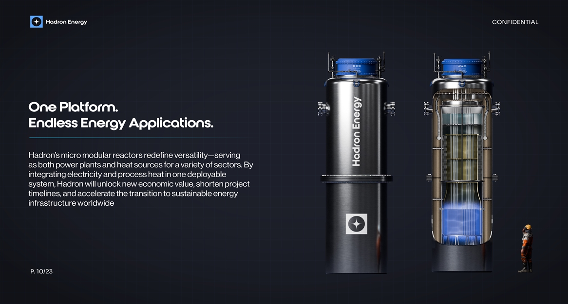 CONFIDENTIAL One Platform. Endless Energy Applications. Hadron’s micro modular reactors redefine versatility—serving as both power plants and heat sources for a variety of sectors. By integrating electricity and process heat in one deployable system, Hadron will unlock new economic value, shorten project timelines, and accelerate the transition to sustainable energy infrastructure worldwide P. 10/23