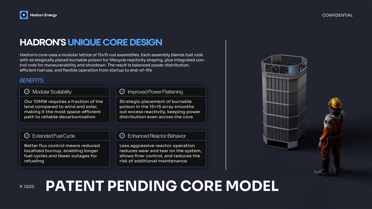CONFIDENTIAL HADRON’S UNIQUE CORE DESIGN Hadron’s core uses a modular lattice of 15x15 rod assemblies. Each assembly blends fuel rods with strategically placed burnable poison for lifecycle reactivity shaping, plus integrated con- trol rods for maneuverability and shutdown. The result is balanced power distribution, efficient fuel use, and flexible operation from startup to end-of-life BENEFITS: Modular Scalability Improved Power Flattening Our 10MW requires a fraction of the Strategic placement of burnable land compared to wind and solar, poison in the 15×15 array smooths making it the most space-efficient out excess reactivity, keeping power path to reliable decarbonization distribution even across the core Extended Fuel Cycle Enhanced Reactor Behavior Better flux control means reduced Less aggressive reactor operation localized burnup, enabling longer reduces wear and tear on the system, fuel cycles and fewer outages for allows finer control, and reduces the refueling risk of additional maintenance P. 12/23 PATENT PENDING CORE MODEL