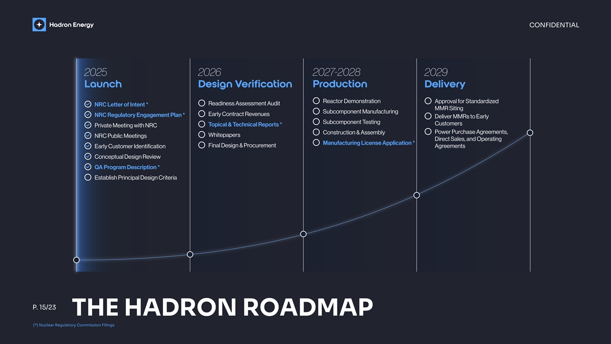 CONFIDENTIAL 2025 2026 202 7 -202 8 2029 Launch Design Verification Production Delivery Reactor Demonstration Approval for Standardized Readiness Assessment Audit NRC Letter of Intent * MMR Siting Subcomponent Manufacturing Early Contract Revenues NRC Regulatory Engagement Plan * Deliver MMRs to Early Subcomponent Testing Customers Topical & Technical Reports * Private Meeting with NRC Power Purchase Agreements, Construction & Assembly Whitepapers NRC Public Meetings Direct Sales, and Operating Manufacturing License Application * Final Design & Procurement Agreements Early Customer Identification Conceptual Design Review QA Program Description * Establish Principal Design Criteria P. 15/23 THE HADRON ROADMAP (*) Nuclear Regulatory Commission Filings