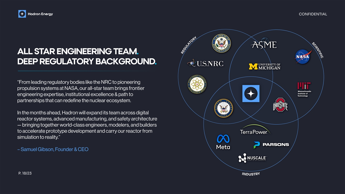 I N D U CONFIDENTIAL ALL STAR ENGINEERING TEAM. DEEP REGULATORY BACKGROUND. “From leading regulatory bodies like the NRC to pioneering propulsion systems at NASA, our all-star team brings frontier engineering expertise, institutional excellence & path to partnerships that can redefine the nuclear ecosystem. In the months ahead, Hadron will expand its team across digital reactor systems, advanced manufacturing, and safety architecture — bringing together world-class engineers, modelers, and builders to accelerate prototype development and carry our reactor from simulation to reality.” – Samuel Gibson, Founder & CEO P. 18/23 S T R Y