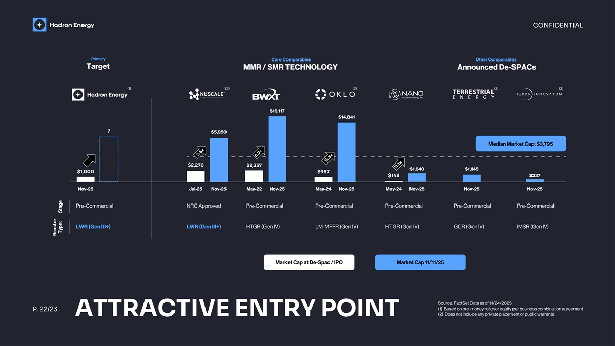 CONFIDENTIAL Primary Core Comparables Other Comparables Target MMR / SMR TECHNOLOGY Announced De-SPACs (1) (2) (2) (2) (2) $16,117 $14,841 ? $5,950 Median Market Cap: $3,795 $2,276 $2,337 $1,640 $1,145 $1,000 $957 $148 $337 Nov-25 Jul-25 Nov-25 May-22 Nov-25 May-24 Nov-25 May-24 Nov-25 Nov-25 Nov-25 Pre-Commercial NRC Approved Pre-Commercial Pre-Commercial Pre-Commercial Pre-Commercial Pre-Commercial LWR (Gen III+) LWR (Gen III+) HTGR (Gen IV) LM-MFFR (Gen IV) HTGR (Gen IV) GCR (Gen IV) IMSR (Gen IV) Market Cap at De-Spac / IPO Market Cap 11/11/25 Source: FactSet Data as of 11/24/2025 (1) Based on pre-money rollover equity per business combination agreement P. 22/23 (2) Does not include any private placement or public warrants ATTRACTIVE ENTRY POINT 2.6x 6.9x 15.5x 11.1x Reactor Type: Stage