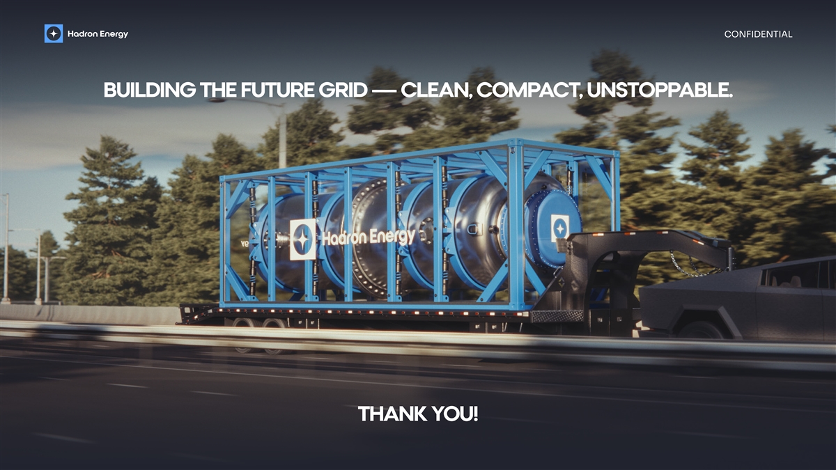 CONFIDENTIAL We've assembled an all-star engineering team, launched digital twin development, and filed 4 patents, both NUCLEAR IS SLOW utility and design, alongside securing 6 copyrights and trademarks. Our breakthrough patent-pending MMR core design anchors a strong IP foundation as we engage with the DOD, DOE, and NRC. Having already BUT WE ARE FAST engaged at the letter of intent stage with more than 6 potential customers, Hadron is scaling fast. Market Overview Commercial Traction Significant Government DOE Projects Power Growth Multiple GWs Pipeline of Interest From Potential (1) Support of 15-20% by 2035 Near-term Opps Customers for Hundreds of Units 100% of Approved Reactors in Strong Push for Low Carbon Active Discussions with the U.S. are Light Water Designs Energy Solutions Leading Hyperscalers Product Regulatory & Scientific Engagements 10-Year Refueling Cycle 50-Year Useful Life 10 MW of Electrical Power 35 MW of Thermal Power P. 20/23 DEMONSTRATED TRACTION Source: (1) IEA, Demand: Global electricity use to grow strongly in 2025 and 2026