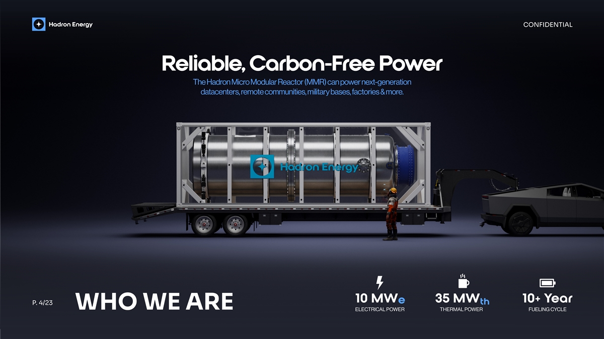 CONFIDENTIAL Reliable, Carbon-Free Power The Hadron Micro Modular Reactor (MMR) can power next-generation datacenters, remote communities, military bases, factories & more. 10 MW 35 MW 10+ Year e th P. 4/23 WHO WE ARE ELECTRICAL POWER THERMAL POWER FUELING CYCLE