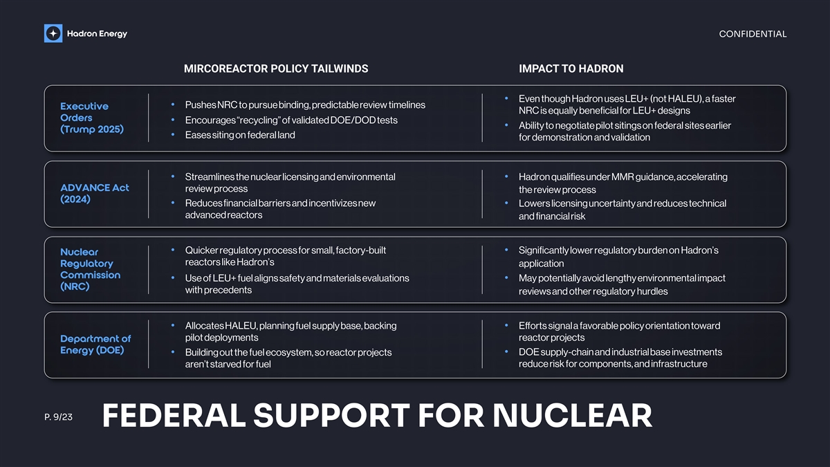 CONFIDENTIAL MIRCOREACTOR POLICY TAILWINDS IMPACT TO HADRON • Even though Hadron uses LEU+ (not HALEU), a faster • Pushes NRC to pursue binding, predictable review timelines Executive NRC is equally beneficial for LEU+ designs Orders • Encourages “recycling” of validated DOE/DOD tests • Ability to negotiate pilot sitings on federal sites earlier (Trump 2025) • Eases siting on federal land for demonstration and validation • Streamlines the nuclear licensing and environmental • Hadron qualifies under MMR guidance, accelerating ADVANCE Act review process the review process (2024) • Reduces financial barriers and incentivizes new • Lowers licensing uncertainty and reduces technical advanced reactors and financial risk • Quicker regulatory process for small, factory-built • Significantly lower regulatory burden on Hadron’s Nuclear reactors like Hadron’s Regulatory application Commission • May potentially avoid lengthy environmental impact • Use of LEU+ fuel aligns safety and materials evaluations (NRC) with precedents reviews and other regulatory hurdles • Allocates HALEU, planning fuel supply base, backing • Efforts signal a favorable policy orientation toward pilot deployments reactor projects Department of Energy (DOE) • DOE supply-chain and industrial base investments • Building out the fuel ecosystem, so reactor projects aren’t starved for fuel reduce risk for components, and infrastructure P. 9/23 FEDERAL SUPPORT FOR NUCLEAR