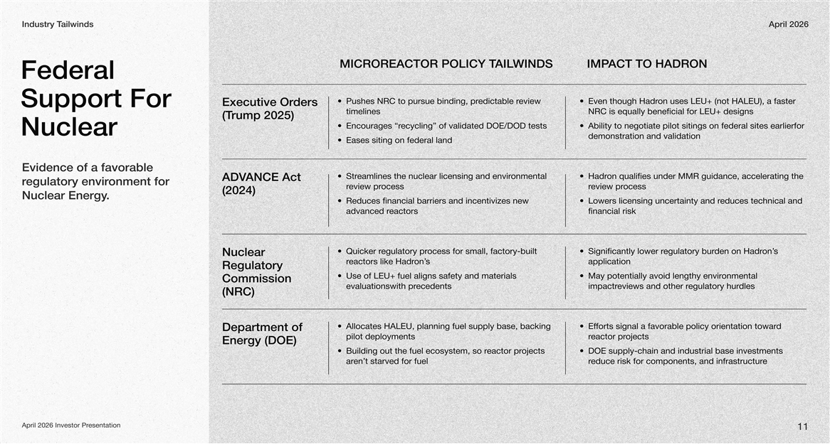 ailwindsIndustry TApril 2026 Compelling Industry ailwindT Significant market and SIGNIFICANT GOVERNMENT A CENTER ENERGY TAI & DAY OF NRC HISTOR ovide egulatory tailwinds prr TSUPPOR DEMANDALAPPROV favorable conditions for ders signed in May 2025, 4 Executive Orom AI data centers alone Electricity demand fre the only type of eactors arater rLight W om NRC / ANCE Act 2024, and support frADVwill 4X+ by 2030 (1),making MMRs an attractive oval by The U.S. eceived apprdesigns that have r .on EnergyHadr gy DOE / White House bolster the Nuclear Enereliable powersolution for clean, rNuclear Regulatory Commission, with 94 prior momentumovals, including 1 SMR (2)appr INVESTOR & HYPERSCALER TECHNOLOGICAL GLOAL PUSH FOR LOBW INTERESTANCEMENTSADVBONCAR gy e exploring MMRs for their enerCompanies are eactor corContinuous advancements in rong push for lowA strgy solutions carbon ener- on engaged in advanced needs, with Hadres, & digital integration for design, safety featurto combat climate change is an important driver discussions for data center applicationsMMR efficiency and performance based on for MMR markowthet gr Naval Reactor technology gy Agency (1) International Ener (2) United States Nuclear Regulatory Commission 10