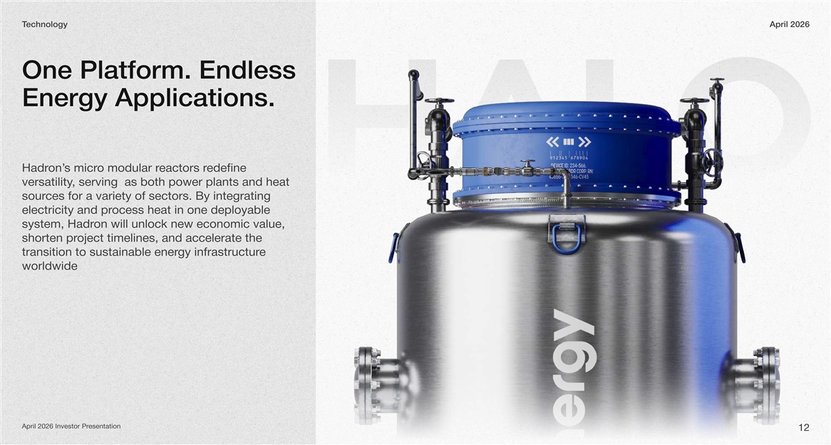 echnologyTApril 2026 One Platform. Endless Energy Applications. edefine eactors ro modular rs micron’Hadr HALO , serving as both power plants and heat versatility ces for a variety of sectors. By integrating sour ocess heat in one deployable electricity and pr on will unlock new economic value, system, Hadr oject timelines, and accelerate the shorten pr e gy infrastructurtransition to sustainable ener worldwide esentationApril 2026 Investor Pr 12