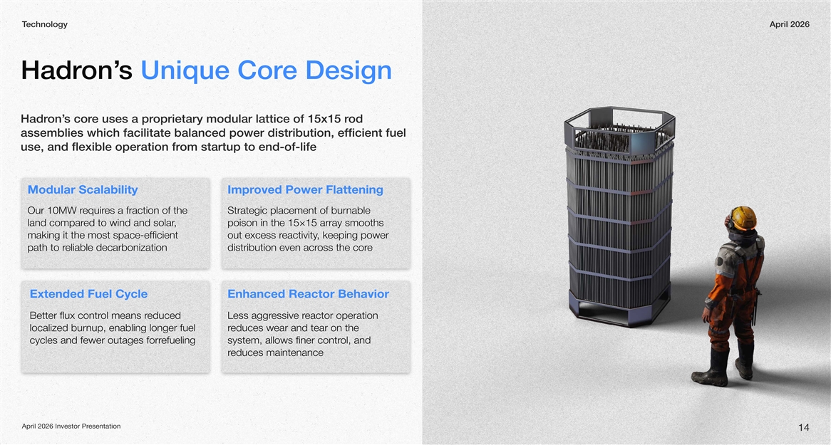 echnologyTApril 2026 e Designs Unique Coron’Hadr od oprietary modular lattice of 15x15 re uses a prs coron’Hadr assemblies which facilitate balanced power distribution, efficient fuel om startup to end-of-lifeuse, and flexible operation fr Modular Scalabilityoved Power FlatteningImpr es a fraction of the equirOur 10MW rStrategic placement of burnable , ed to wind and solarland comparpoison in the 15×15 array smooths making it the most space-efficient , keeping power eactivityout excess r eliable decarbonizationpath to reoss the cordistribution even acr Extended Fuel CycleEnhanced Reactor Behavior educed ol means rBetter flux contreactor operation essive rLess aggr localized burnup, enabling longer fuel educes wear and tear on the r efuelingcycles and fewer outages forrol, and system, allows finer contr educes maintenancer esentationApril 2026 Investor Pr 14