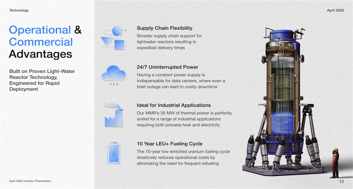 echnologyTApril 2026 Supply Chain Flexibility Operational & oader supply chain support for Br esulting in eactors rlightwater r cial Commer expedited delivery times Advantages 24/7 Uninterrupted Power ater oven Light-WBuilt on Pr Having a constant power supply is , echnologyReactor T e even a indispensable for data centers, wher ed for Rapid Engineer brief outage can lead to costly downtime Deployment Ideal for Industrial Applications s 35 MW of thermal power is perfectly Our MMR’ suited for a range of industrial applications ocess heat and electricityequiring both prr ear LEU+ Fueling Cycle10 Y he 10Tyear low enriched uranium fueling cycle - educes operational costs by drastically r efueling equent reliminating the need for fr esentationApril 2026 Investor Pr 15