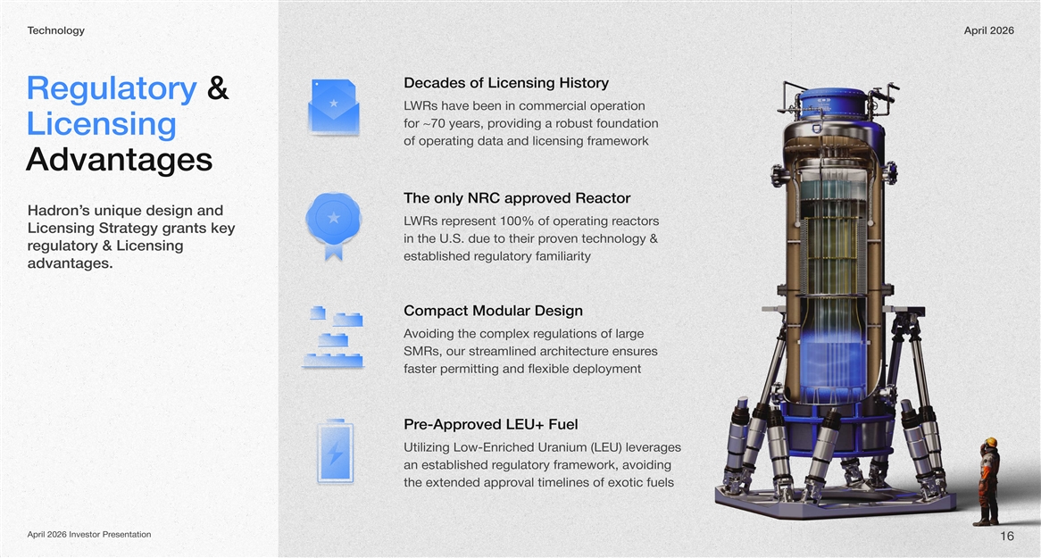 echnologyTApril 2026 Decades of Licensing History Regulatory & WRs have been in commerLcial operation for ~70 years, providing a robust foundation Licensing of operating data and licensing framework Advantages The only NRC approved Reactor s unique design and on’Hadr WRs rLesent 100% of operating repreactors Licensing Strategy grants key in the U.S. due to their proven technology & egulatory & Licensing r established regulatory familiarity advantages. Compact Modular Design voiding the complex rAegulations of large SMRs, our streamlined are ensurchitectures faster permitting and flexible deployment oved LEU+ Fuele-ApprPr Utiliing Lowz-Enriched Uranium (ELU leverages ) an established regulatory framework, avoiding the extended approval timelines of exotic fuels April 2026 Investor Presentation 16