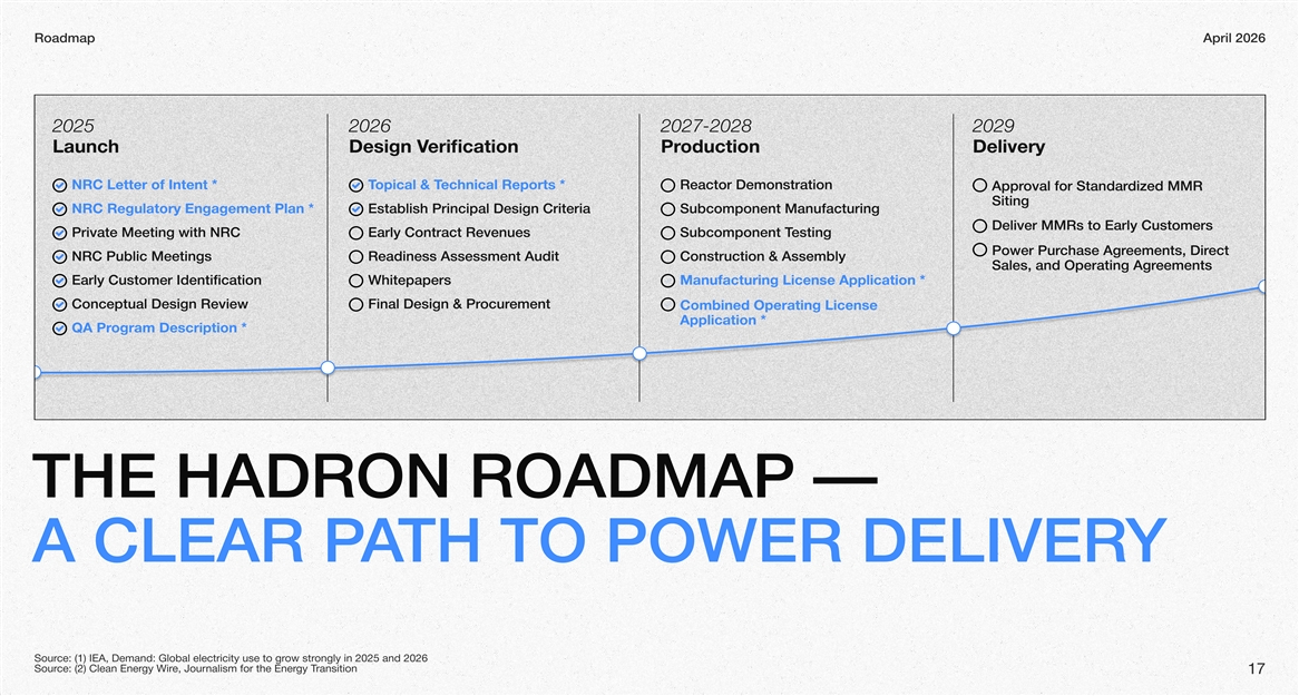 RoadmapApril 2026 2025 2026 2027-2028 2029 LaunchDesign VerificationoductionPrDelivery NRC Letter of Intent *opical & TTechnical Reports *Reactor Demonstration oval Apprfor died MMR zStandar itingS NRC Regulatory Engagement Plan *Establish Principal Design Criteria Subcomponent Manufacturing Deliver MMRs to Early Customers Private Meeting with NRCEarly Contract RevenuesSubcomponent Testing Power Purchase Agreements, Direct NRC Public MeetingsReadiness Assessment AuditConstruction Assembly& alesS and Operating Agr,eements Early Customer IdentificationhitepapersWanufacturing License Application *M Conceptual Design ReviewFinal Design & Prementocur Comd bineOperating License Application * QA Program Description * THE HADRON ROADMAP — A CLEAR PTH TO POWER DELIVERAY ce: (1) IEA, Demand: Global electricity use to grSourow strongly in 2025 and 2026 ce: (2) Clean EnerSourgy Wire, Journalism for the Energy Transition 17
