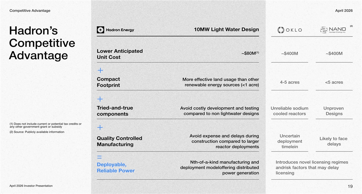 Competitive AdvantageApril 2026 (2) ater Design10MW Light W s on’Hadr Competitive Lower Anticipated (1) ~$80M 00M00M Unit Cost Advantage Compact fective land usage than other e efMor es- acres< acr e)ces (<1 acrenewable energy sourr Footprint ried-and-true T void costly development and testing A eliable sodiunrovennpr ed to non lightwater designscompar eactorscooled resigns components edits or ent or potential tax cr(1) Does not include curr any other government grant or subsidy Publicly available ince:S(2) ourormationf void expense and delays during Ancertain olled Quality Contrikely to face ed to larger construction compardeploymen delays Manufacturing eactor deploymentsrtimelein Nth-of-a-kind manufacturing and egimes oduces novel licensing rntr Deployable, fering distributed deployment modelofandrisk factors that may delay Reliable Power power generationlicensing esentationApril 2026 Investor Pr 19