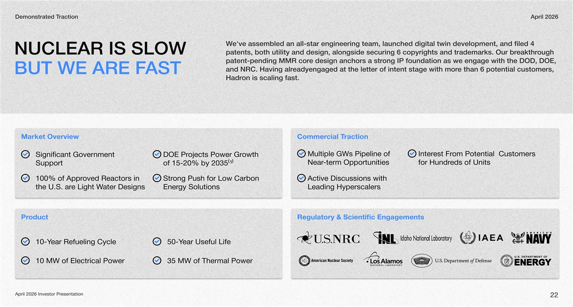 Demonstrated ractionT prilA2026 e'veW assembled an all-star engineering team, launched digitaltwin development,and filed 4 NUCLEAR IS SLOW patents, bothutility anddesign, alongside securing 6copyrights and trademarks. Our ougheakthrbr patent-pendingMMR ecor designanchors a ongstr IP foundation as we engage with the OD,DOE D, and NRC. Having eadyengagedalr at the letter ofintent stage with emorthan 6 potentialcustomers, BUT WE ARE FAST onHadris scaling fast. Market Overview lciaCoermmTraction Multiple GWs Pipeline of est FrInterom Potential Customers Significant Government DOE Projects Power Growth -term OpportunitiesNearfor Hundreds of Units Supportof 15-20% by 2035(1) 100% of Approved Reactors in ong Push for Low Carbon StrActive Discussions with the U.S. are Light Water Designsgy SolutionsEnerLeading Hyperscalers oductPrRegylatoru & tincieSc fiEngagemsnte ear Refueling Cycle10-Year Useful Life 50-Y 10 MW of Electrical Power35 MW of Thermal Power April 2026 Investor Presentation 22