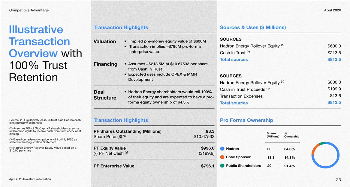 Competitive AdvantageApril 2026 Tsranaction lightigHhsceSour s & sesU($ illionM s) Illustrative SOURCES Implied pre-money equity value of $600M aluationV ransaction T on EnerHadrgy Rollover Equity (4) $600.0 Transaction implies ~$796M pro-forma enterprise value Cash in Trust (2) $213.5 Overview with otal sourTces$813.5 Assumes ~$213.5M at $10.67533 per share Financing 100% Trust om Cash in Tfrrust Expected uses include OPEX & MMR SOURCES RetentionDevelopment $600.0 onHadr gyEnerRollover Equity4() $1999 . Cash in rustToceedsPr (1) on Energy sharHadreholders would roll 100% Deal $13.6 ransactionTExpenses of their equity and are expected to have a pro- eStructur forma equity ownership of 64.3% $813.5 otal Tcessour uorS :ce(1) 7i GgCapitalash-cin-st pltrus uon rdHacash Transaction Hhligigthso ForrPa mOwshpiner less illustrative epenses. x Ass2()umes 0% of s7apitalgCiGdolheers eharerxcise deption riemrts to rgheeive casch omrf trst auont at ccu PF Shares Outstanding (Millions) 93.3 es harS% losincg. illion(Ms)Owshnerpi e Price ($) (3)Shar$10.67533 )(3B on rdaseemdeption price as o April f 2026 as 1, stated in the istration eRgStatemt en (4) on raHdEnergy ollover REqu ityValue based on a PF Equity Ve alu99$.0 6 ondrHa 6064%.3 $100 per s.0e arh () P- FN etCah s(1) ($1999). pSac Sonpsor 13.314%.3 bPlic Suolsderehhar20 21.4% PF nterEripe Vsalue$79.16 April 2026 Investor Presentation 23