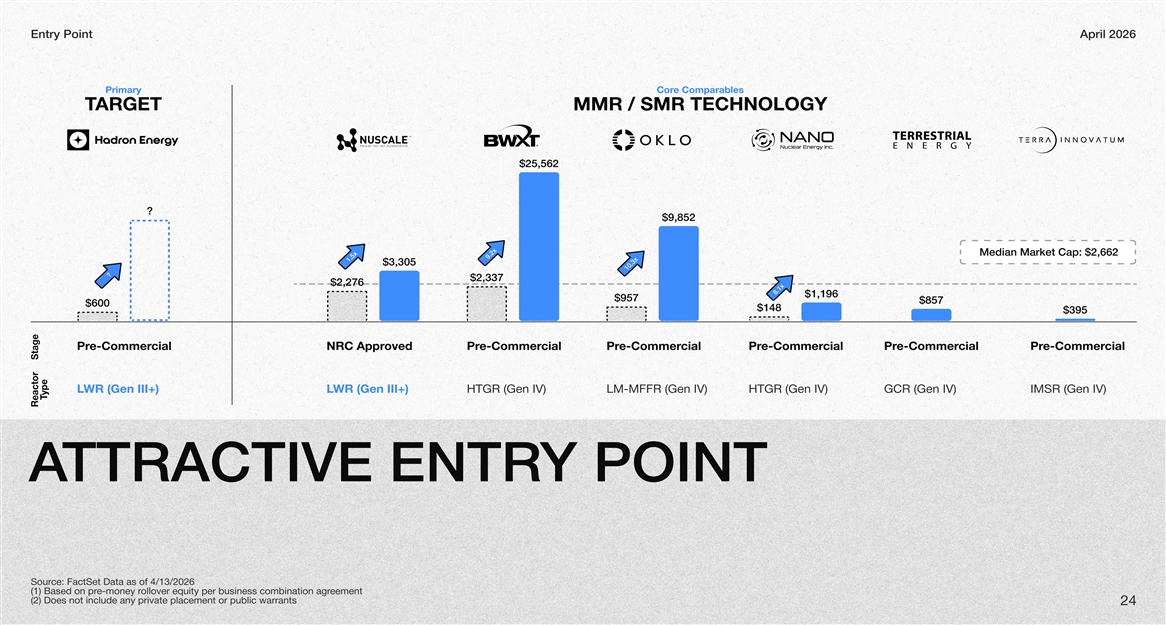 Entry PointApril 2026 Primary e Comparables Cor ARGETTMMR / SMR TECHNOLOGY $25,562 ? $9,852 Median Market Cap: $2,662 9.2x 1.5x $3,305 10.3x ? $2,337 $2,276 8.1x $1,196 $957 $857 $600 $148 $395 ciale-CommerProvedNRC Apprciale-CommerPrciale-CommerPrciale-CommerPrciale-CommerPrciale-CommerPr Stage WR (Gen III+)LWR (Gen III+)LHTGR (Gen IV)LM-MFFR (Gen IV)HTGR (Gen IV)GCR (Gen IV)IMSR (Gen IV) T ype Reactor Y POINTTTRACTIVE ENTRA ce: FactSet Data as of 4/13/2026 Sour eementollover equity per business combination agre-money r(1) Based on pr (2) Does not include any private placement or public warrants 24