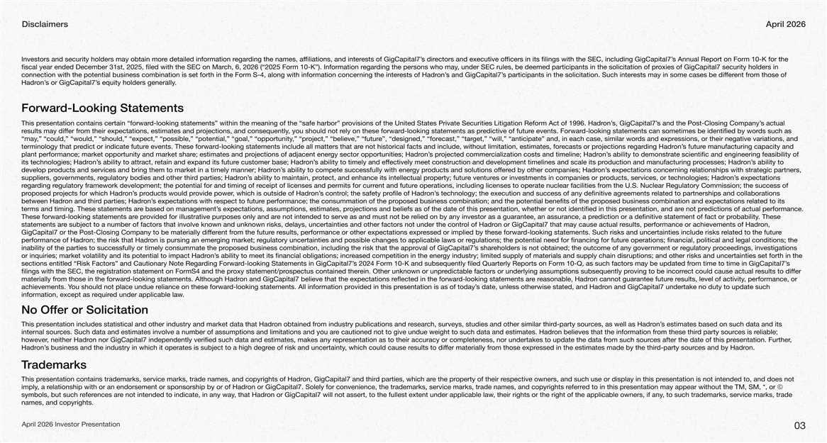 DisclaimersApril 2026 s Annual Report on Form 10-K for the ectors and executive officers in its filings with the SEC, including GigCapital7’s dirests of GigCapital7’ding the names, affiliations, and interegare detailed information rInvestors and security holders may obtain mor oxies of GigCapital7 security holders in , under SEC rules, be deemed participants in the solicitation of prding the persons who mayegarch, 6, 2026 (“2025 Form 10-K”). Information rfiscal year ended December 31st, 2025, filed with the SEC on Mar om those of ent frests may in some cases be differs participants in the solicitation. Such inters and GigCapital7’on’connection with the potential business combination is set forth in the Form S-4, along with information concerests of Hadrning the inter .s equity holders generallys or GigCapital7’on’Hadr d-Looking StatementsForwar s actual s and the Post-Closing Company’s, GigCapital7’on’ovisions of the United States Private Securities Litigation Reform Act of 1996. Hadrd-looking statements” within the meaning of the “safe harbor” presentation contains certain “forwarThis pr ds such as d-looking statements can sometimes be identified by wore events. Forwaredictive of futurd-looking statements as prely on these forwar, you should not rojections, and consequentlyom their expectations, estimates and presults may differ frr essions, or their negative variations, and ds and exprget,” “will,” “anticipate” and, in each case, similar worecast,” “tare”, “designed,” “foroject,” “believe,” “futur,” “pr,” “could,” “would,” “should,” “expect,” “possible,” “potential,” “goal,” “opportunity“may e manufacturing capacity and s futuron’ding Hadregarojections recasts or pre not historical facts and include, without limitation, estimates, ford-looking statements include all matters that are events. These forwaredict or indicate futurterminology that pr s ability to demonstrate scientific and engineering feasibility of on’cialization costs and timeline; Hadrojected commers pron’gy sector opportunities; Hadrojections of adjacent enere; estimates and prplant performance; market opportunity and market shar s ability to on’ocesses; Hadroduction and manufacturing prs ability to timely and effectively meet construction and development timelines and scale its pron’e customer base; Hadretain and expand its futurs ability to attract, ron’its technologies; Hadr s expectations concerelationships with strategic partners, ning ron’ed by other companies; Hadroducts and solutions offergy prs ability to compete successfully with eneron’oducts and services and bring them to market in a timely manner; Hadrdevelop pr s expectations on’oducts, services, or technologies; Hadres or investments in companies or pre venturoperty; futurotect, and enhance its intellectual prs ability to maintain, pron’d parties; Hadrsuppliers, goveregulatory bodies and other thirnments, r om the U.S. Nuclear Regulatory Commission; the success of e operations, including licenses to operate nuclear facilities frent and futureceipt of licenses and permits for curregulatory framework development; the potential for and timing of rding regarr elated to partnerships and collaborations eements rs technology; the execution and success of any definitive agron’ofile of Hadrol; the safety prs contron’, which is outside of Hadrovide poweroducts would prs pron’ojects for which Hadroposed prpr elated to its oposed business combination and expectations roposed business combination; and the potential benefits of the pre performance; the consummation of the prespect to futurs expectations with ron’d parties; Hadron and thirbetween Hadr edictions of actual performance. e not presentation, and aresentation, whether or not identified in this projections and beliefs as of the date of this prs expectations, assumptions, estimates, pre based on management’terms and timing. These statements ar . These obabilityediction or a definitive statement of fact or prelied on by any investor as a guarantee, an assurance, a pre not intended to serve as and must not be rovided for illustrative purposes only and are prd-looking statements arThese forwar on, esults, performance or achievements of Hadron or GigCapital7 that may cause actual rol of Hadre subject to a number of factors that involve known and unknown risks, delays, uncertainties and other factors not under the contrstatements ar e elated to the futurd-looking statements. Such risks and uncertainties include risks ressed or implied by these forwaresults, performance or other expectations expre rom the futurent frGigCapital7 or the Post-Closing Company to be materially differ e operations; financial, political and legal conditions; the egulations; the potential need for financing for futuregulatory uncertainties and possible changes to applicable laws or rging market; ron is pursing an emeron; the risk that Hadrperformance of Hadr oceedings, investigations eholders is not obtained; the outcome of any goveregulatory prnment or rs sharoval of GigCapital7’oposed business combination, including the risk that the apprinability of the parties to successfully or timely consummate the pr gy industry; limited supply of materials and supply chain disruptions; and other risks and uncertainties set forth in the eased competition in the eners ability to meet its financial obligations; incron’or inquiries; market volatility and its potential to impact Hadr s om time to time in GigCapital7’s 2024 Form 10-K and subsequently filed Quarterly Reports on Form 10-Q, as such factors may be updated frd-looking Statements in GigCapital7’ding Forwarsections entitled “Risk Factors” and Cautionary Note Regar esults to differ ect could cause actual roving to be incorredictable factors or underlying assumptions subsequently prein. Other unknown or unprospectus contained theroxy statement/pregistration stat