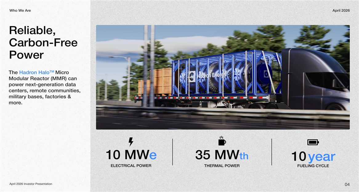 ee ArWho WApril 2026 Reliable, ee Carbon-Fr Power TM on HaloThe Hadro Micr Modular Reactor (MMR) can power next-generation data emote communities, centers, r military bases, factories & e.mor e10 MW 35 MWth 10 year ELECTRICAL POWER THERMAL POWERFUELING CYCLE esentationApril 2026 Investor Pr 04