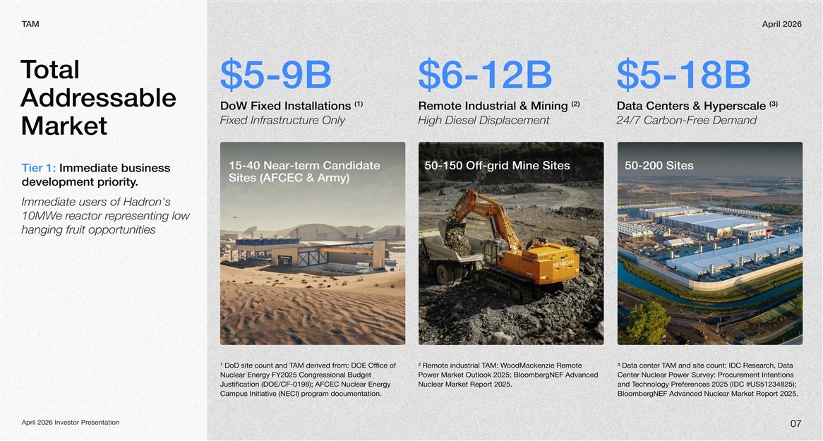 AMTApril 2026 otal T $5-9B$6-12B$5-18B (1) (2) (3) essable Addr DoW Fixed Installations Remote Industrial & Mining Data Centers & Hyperscale Fixed Infrastructure OnlyHigh Diesel Displacement24/7 Carbon-Free Demand Market 15-40 Near-term Candidate f-grid Mine Sites50-150 Of50-200 Sites Tier 1: Immediate business Sites (AFCEC & Army) . development priority on's Immediate users of Hadr esenting low epreactor re r10MW hanging fruit opportunities site DoD¹count and Te om: Offico DOEMderiver Adf f R emote indu²Tstrial M:A Wezie dMRamckooenote 3D ata center TA site M andcouRnt: IDC esearD ata ch, NucnerElear gyFY202essional Budgon5g Cret PoMwarer ket Outlook 202mb 5;Blooer AgNEFdevand center CNuclear PooSuy:er Prrvewent Intentions mecur Juficsti198);(DOE/CF-0ation ANucFCEC lear nerEgy Nucklear arMet 5.eport 202Rd Tane Prgychnoloeenes 202cferI5 #US51DC (34825); 2 amC(NECs Initiative upmragoI pr)docum entation.BmblooergNEF AeNucdvan cdlear et arkMReport 2025. esentationApril 2026 Investor Pr 07