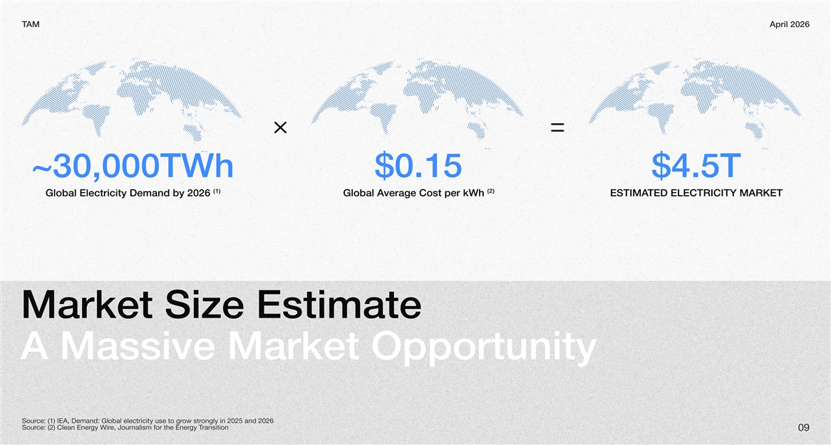 AMTApril 2026 ~30,000TWh$0.15$4.5T (1)(2) Global Electricity Demand by 2026 verage Cost per kWh Global ATED ELECTRICITY MARKETESTIMA Market Size Estimate A Massive Market Opportunity ongly in 2025 and 2026 ow strce: (1) IEA, Demand: Global electricity use to grSour ransitiongy Te, Journalism for the Energy Wirce: (2) Clean EnerSour 09
